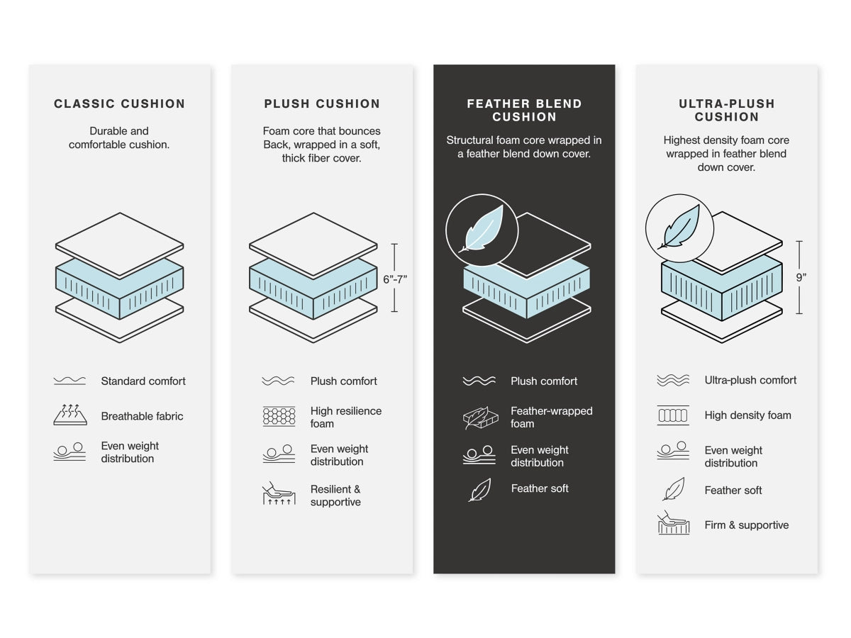 The cushions do the work. Feather-fiber blend seat cushions and removable back cushions give you that sink-in comfort without going soft over time. Arm bolster pillows are included.